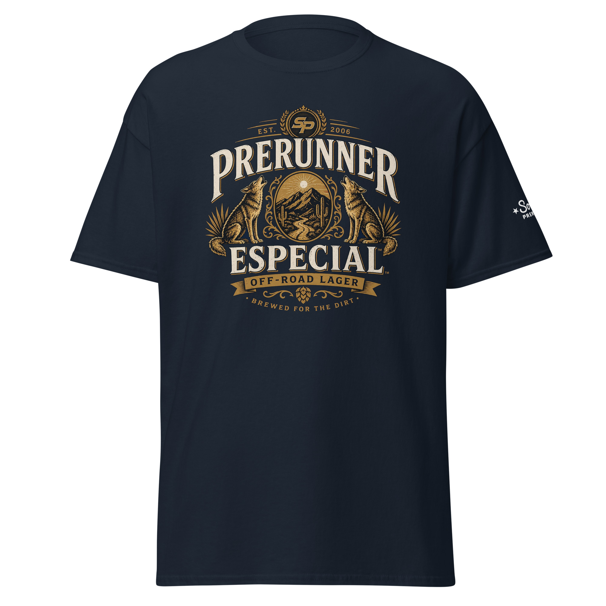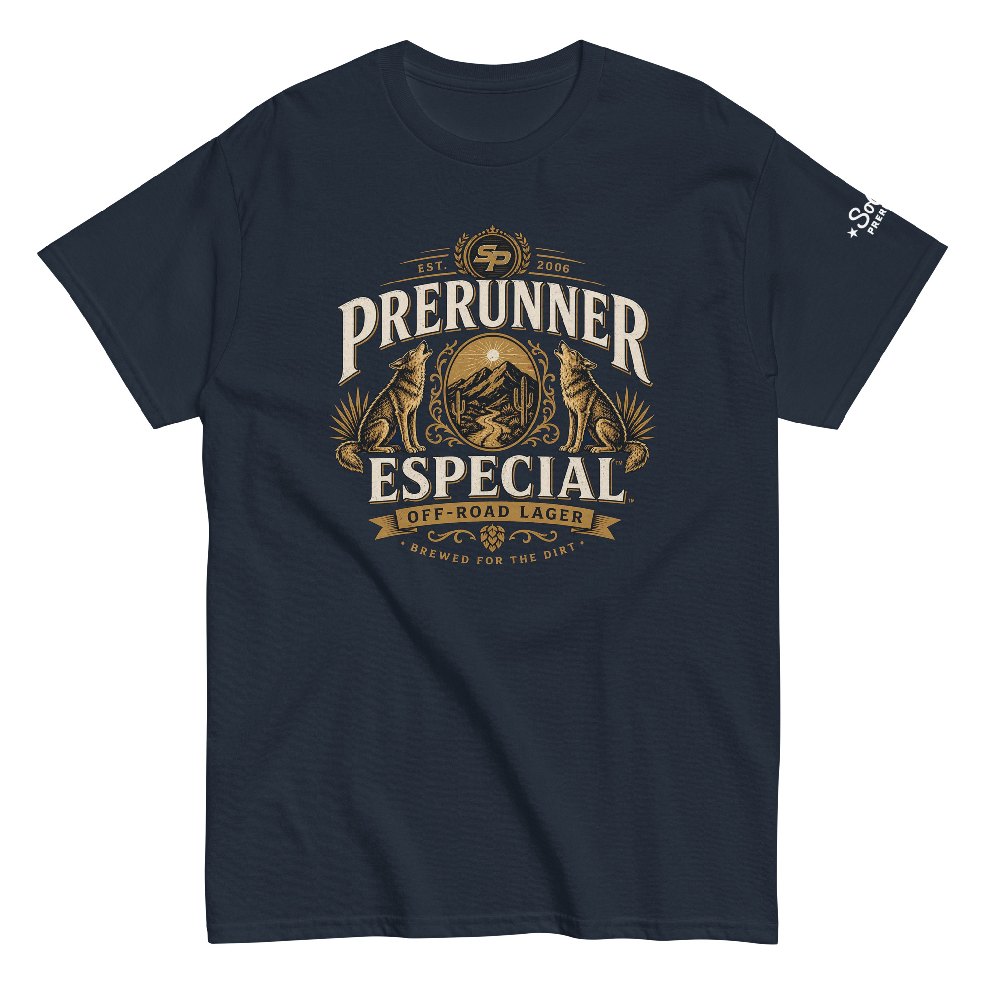 The Prerunner Especial Tee brings a premium edge to off-road apparel. Inspired by classic cerveza label aesthetics, this design features a bold crest layout with desert mountains, a sunlit horizon, and twin coyotes — all tied together with clean, balanced typography.